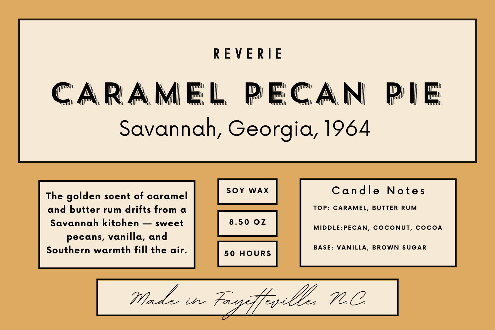 Caramel Pecan Pie captures the sweet comfort of Savannah, Georgia, in 1964 — sunlight slipping through lace curtains, laughter in a warm kitchen, and the scent of golden pie drifting through the house. It opens with notes of rich caramel and butter rum, melting into roasted pecan and cocoa, while hints of vanilla and brown sugar linger like a Southern drawl. It’s the memory of home, wrapped in warmth and nostalgia.