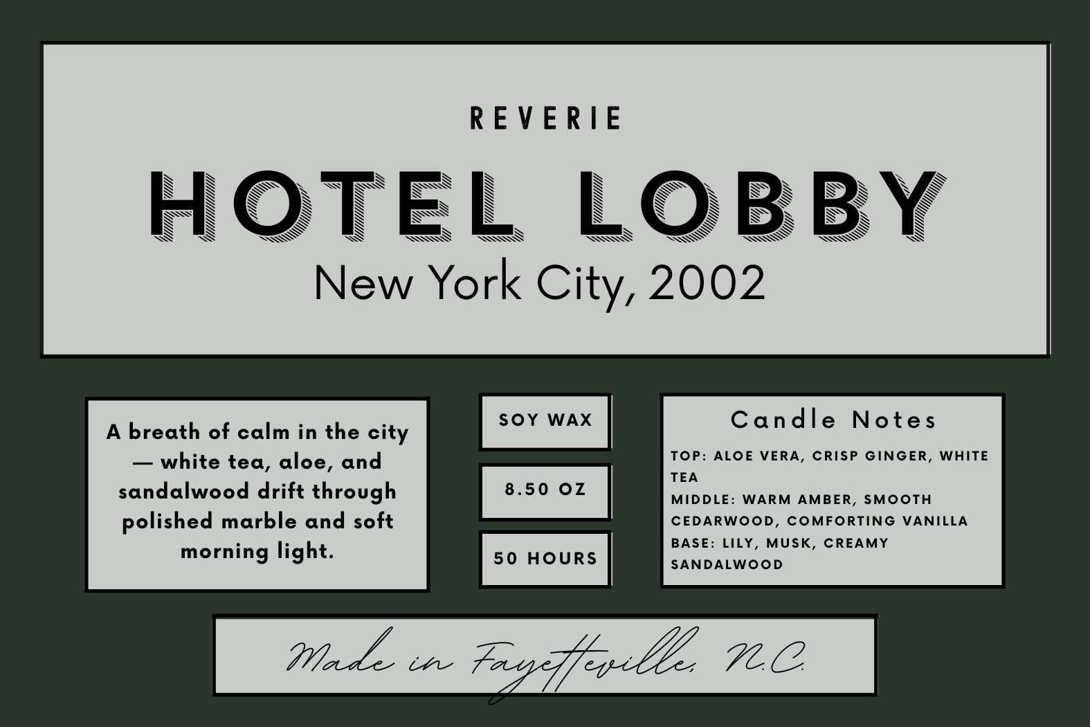 Hotel Lobby invites you into a moment of arrival in New York City, 2002 — tall windows spilling early morning light, polished marble floors, and the soft hush of footsteps and conversation. The scent opens with refreshing aloe vera and bright ginger over delicate white tea. It deepens into warm amber, smooth cedarwood and comforting vanilla, before settling into a base of lily, musk and creamy sandalwood. It’s the calm after the journey begins — luxurious, grounded and quietly refined.