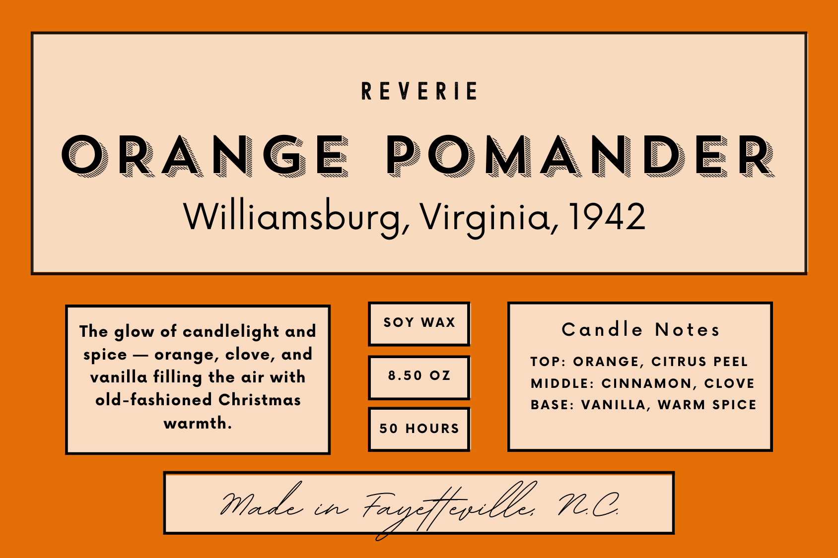 Orange Pomander captures the scent of Christmas in Williamsburg, Virginia, 1942 — wreaths on every door, garlands of fruit and spice, and the glow of candlelight through frosted windows. The fragrance opens with bright orange and citrus peel, wrapped in comforting notes of cinnamon and clove. A base of vanilla and warm spice lingers in the air like a memory of holiday gatherings and home. It’s festive, timeless, and filled with old-fashioned warmth.