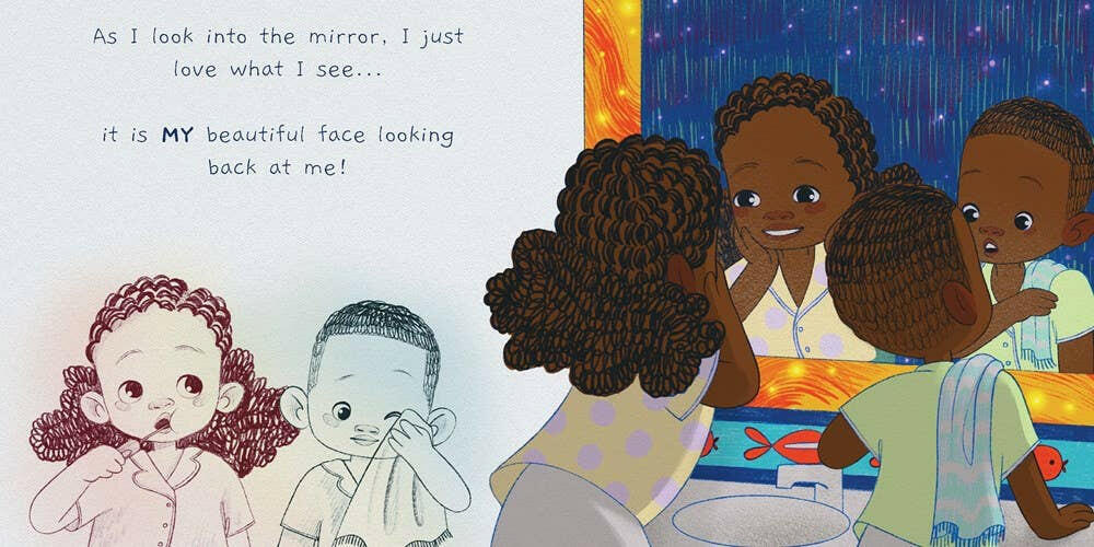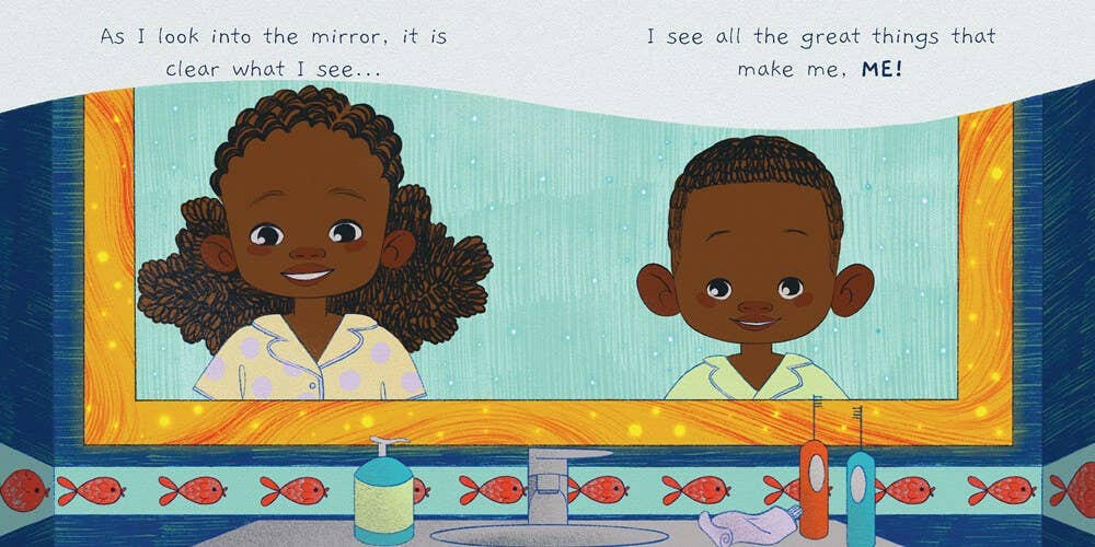 In the Mirror, is an inspiring book of self-affirmation for children. It tells the story of two siblings who embrace themselves for who they are and appreciate the little things that make them stand out. From their sweaty, wrinkly brows and their curious little eyes, all the way to their strong little chins, these two little kids see the goodness in everything!