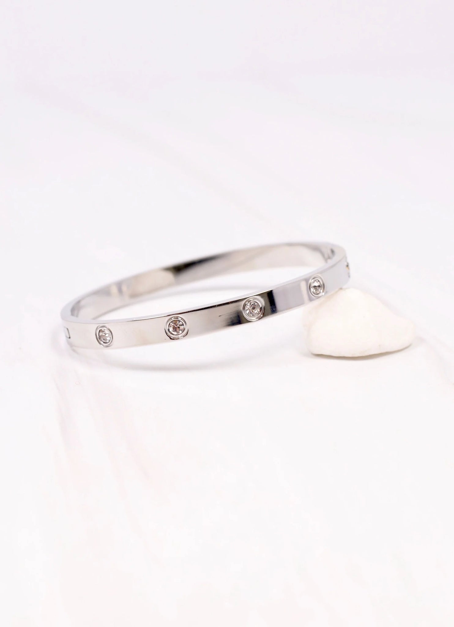 This stylish bracelet features a shiny metal finish and is beautifully adorned with CZ stones. It is a versatile accessory perfect for wearing alone or stacking with other pieces. It also has a convenient side clasp closure and is made with stainless steel.