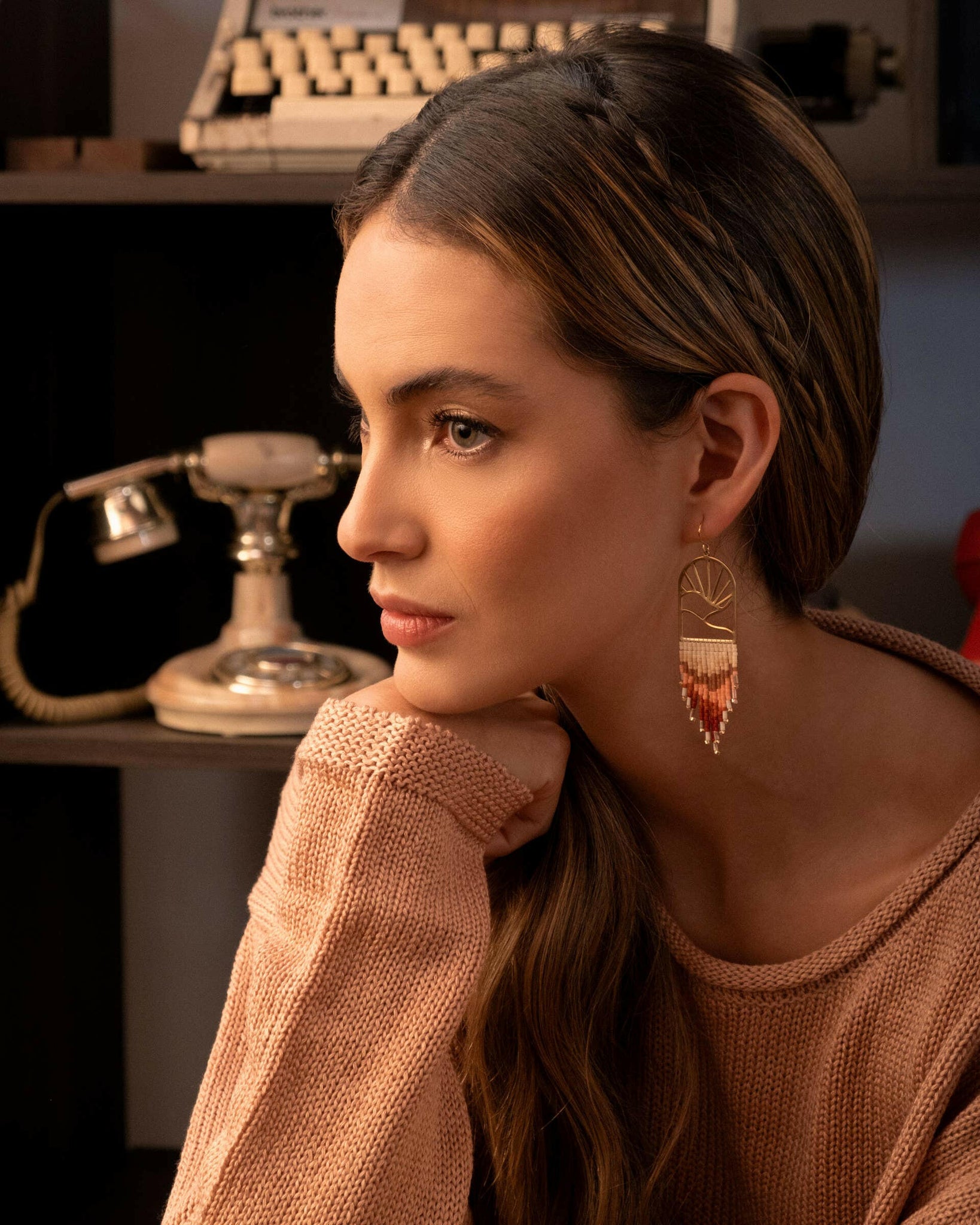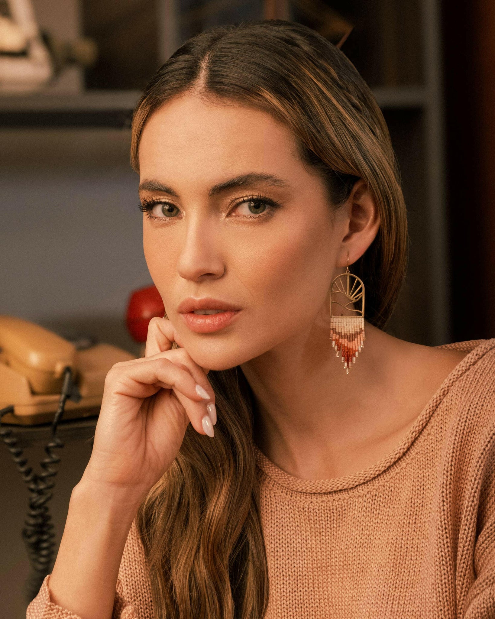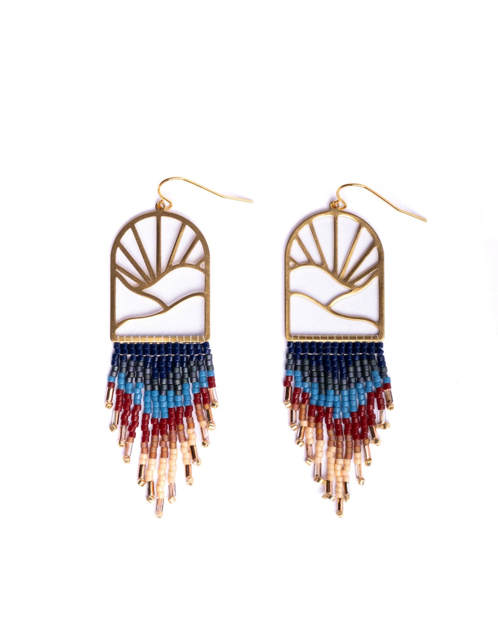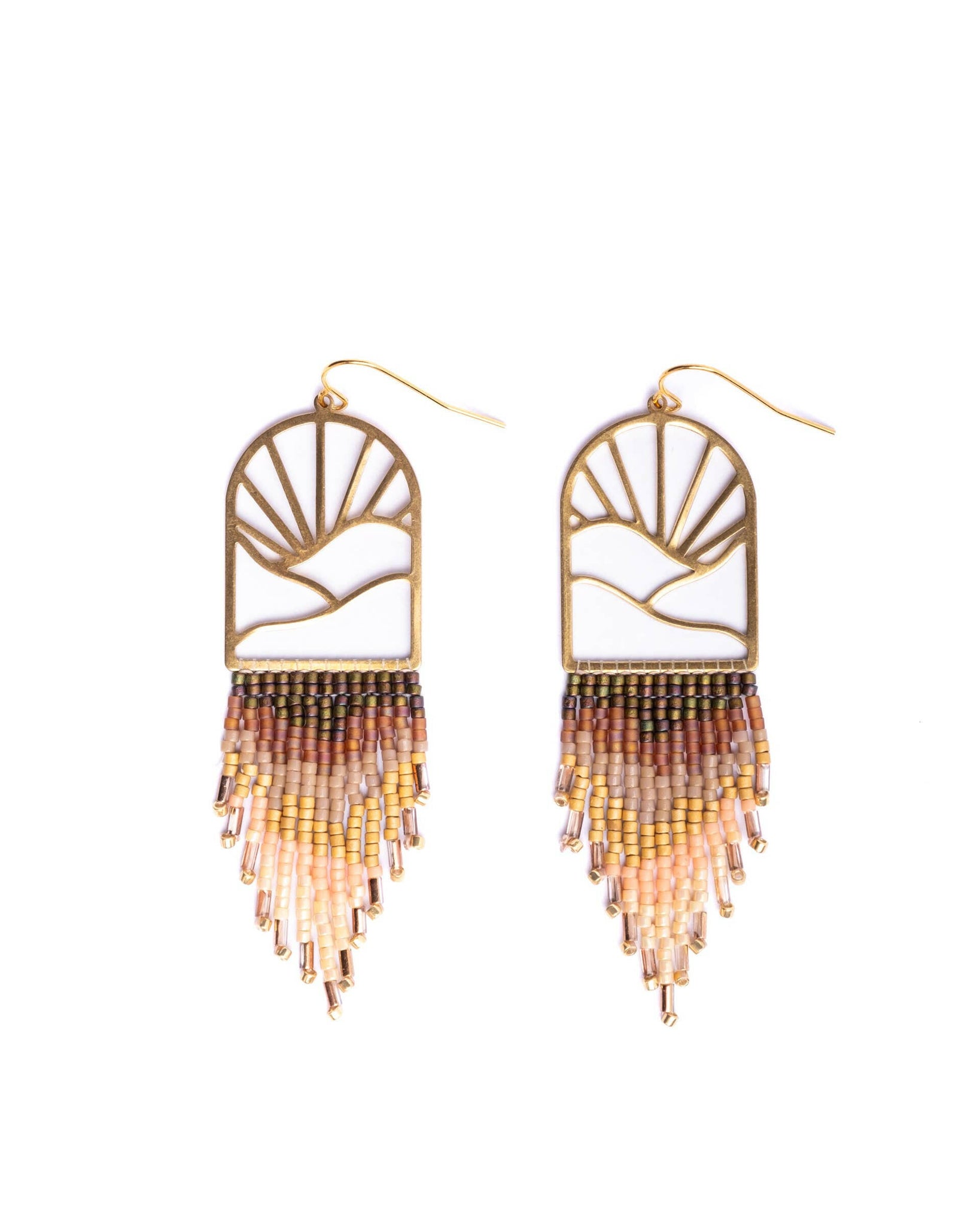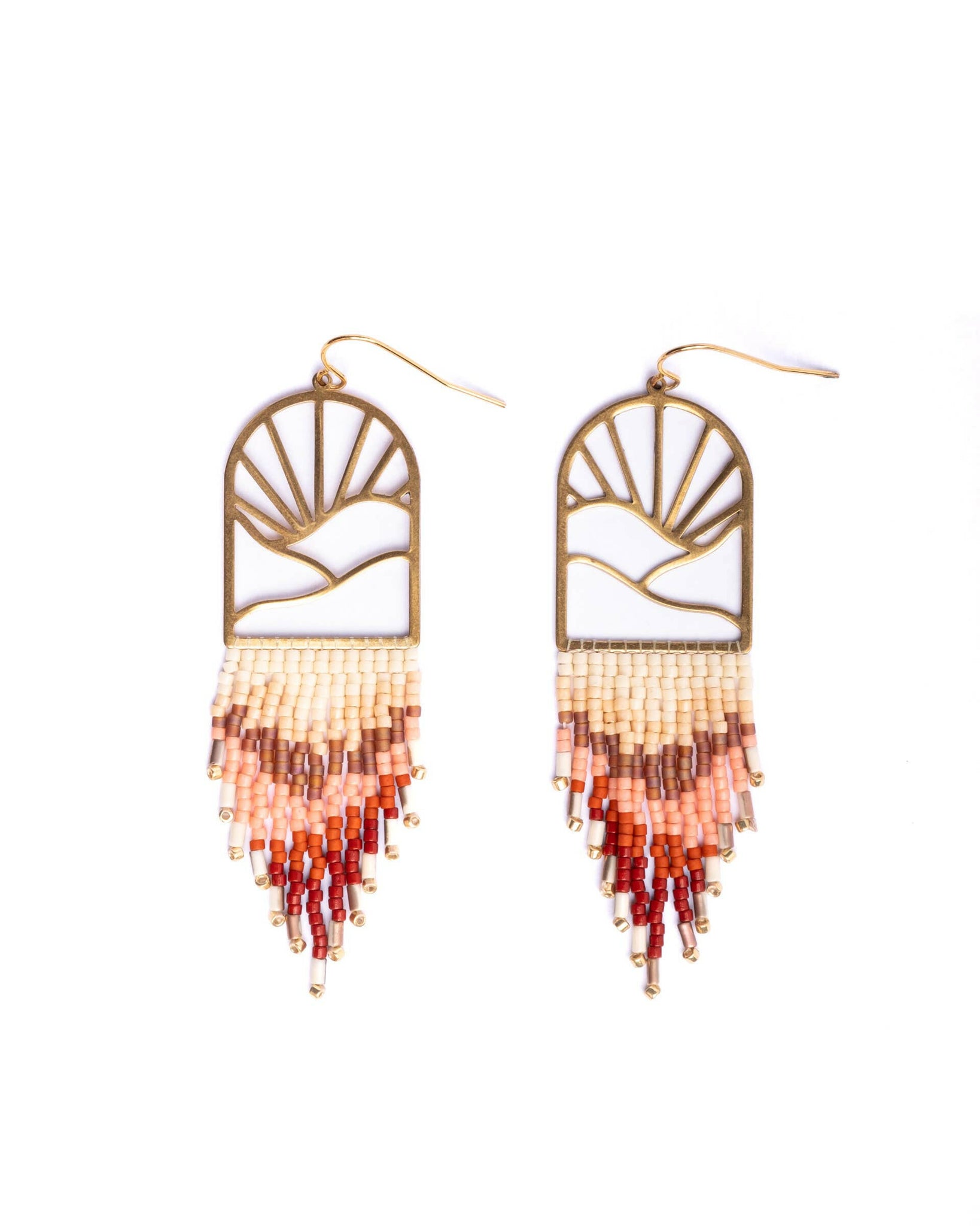 Inspired by southwestern sunsets, these beautifully crafted fringe earrings are made from premium Japanese Miyuki glass beads and stunning brass component. The hand strung fringe features a gorgeous abstract color pattern, and each strand is finished with a tube bead and gold bead for added shimmer. These lightweight versatile earrings will quickly become a favorite. These earrings are hung from gold-plated ear wires fitted with a silicone backing for security.