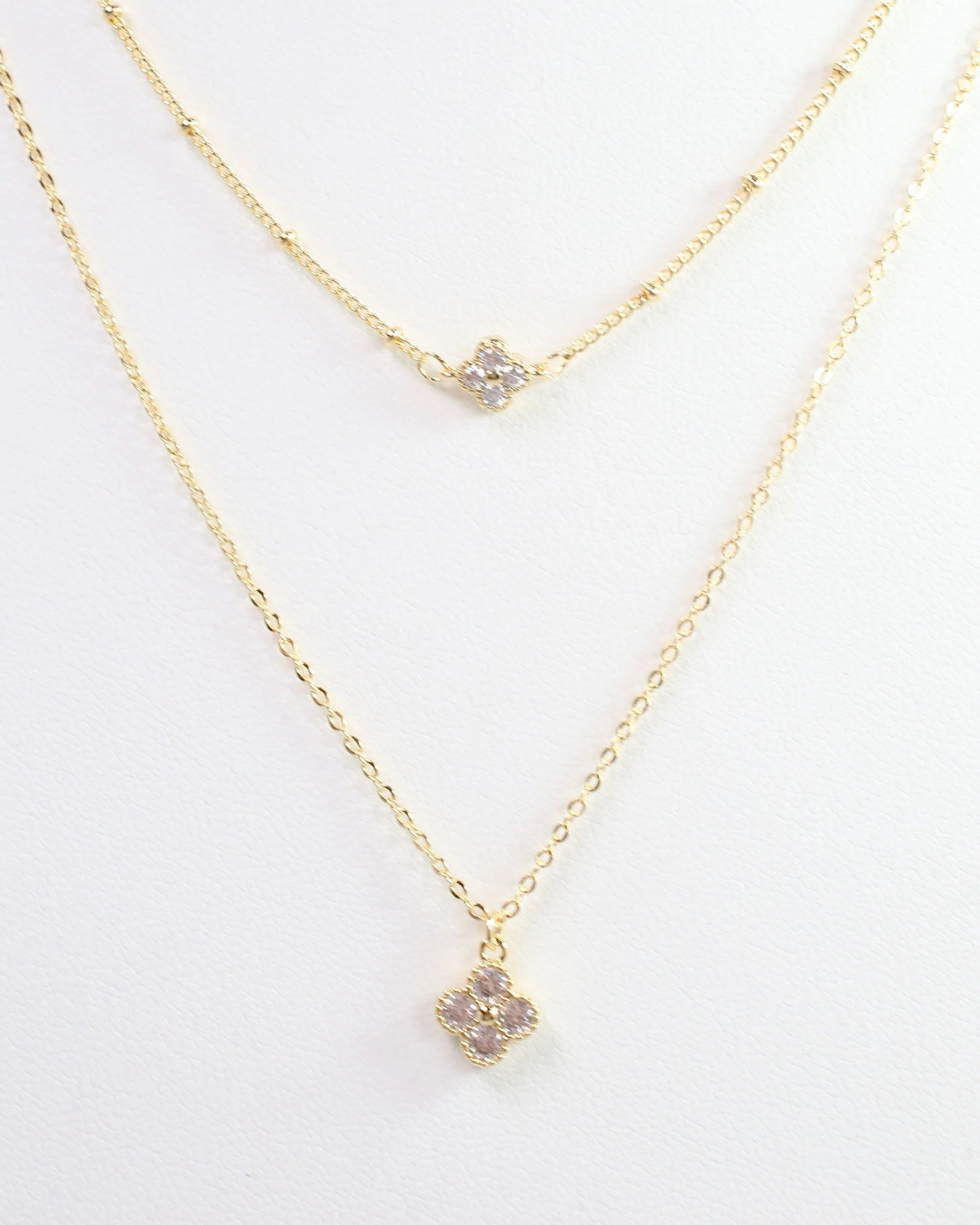 Get ready to shine with the Brennan Clover Necklace in Gold! This stunning two layer necklace features a dainty CZ clover pendant, adding a touch of sparkle to your outfit. The top layer is a dotted chain, while the bottom layer is a traditional chain, creating a fashionable layered look. Perfect for effortlessly elevating any outfit!