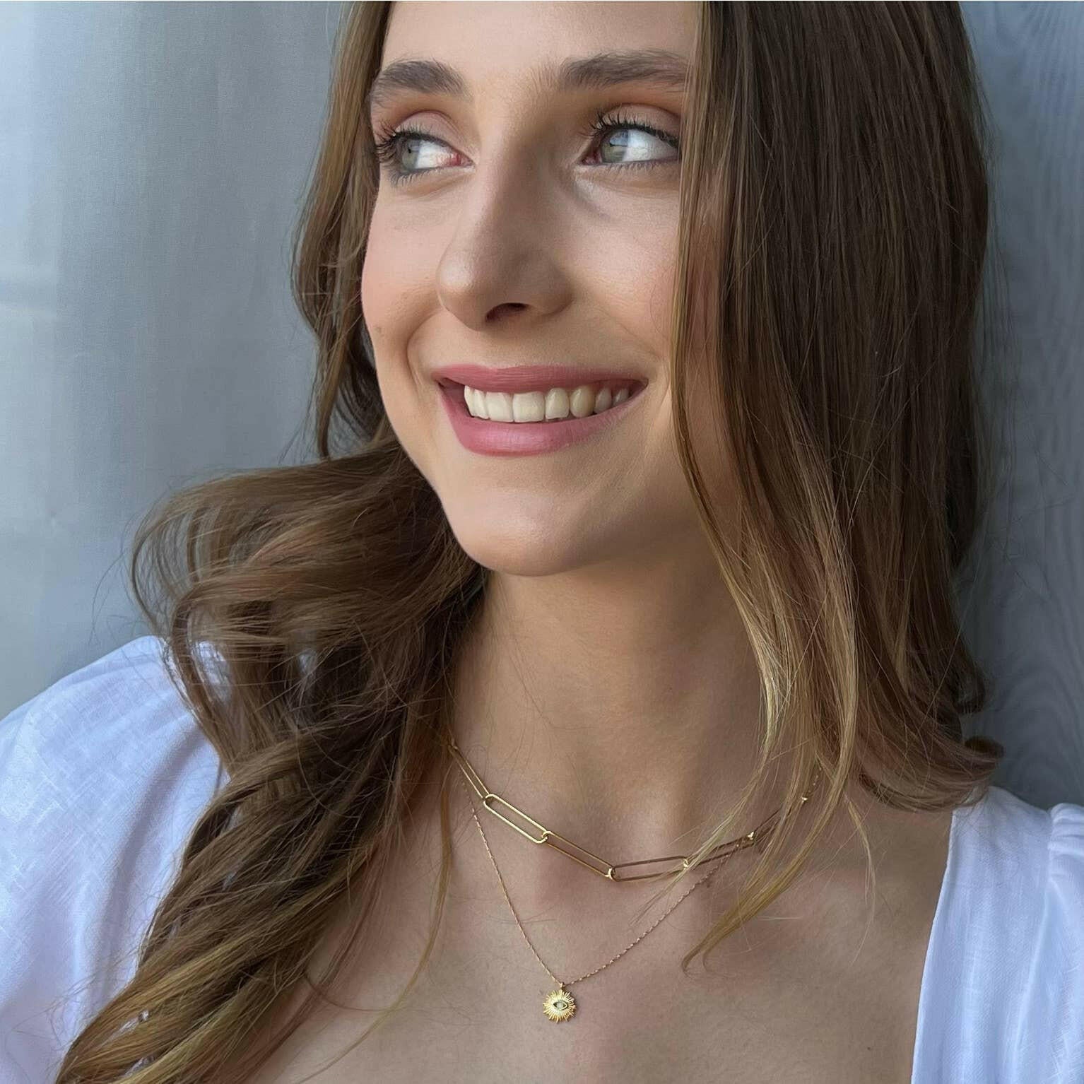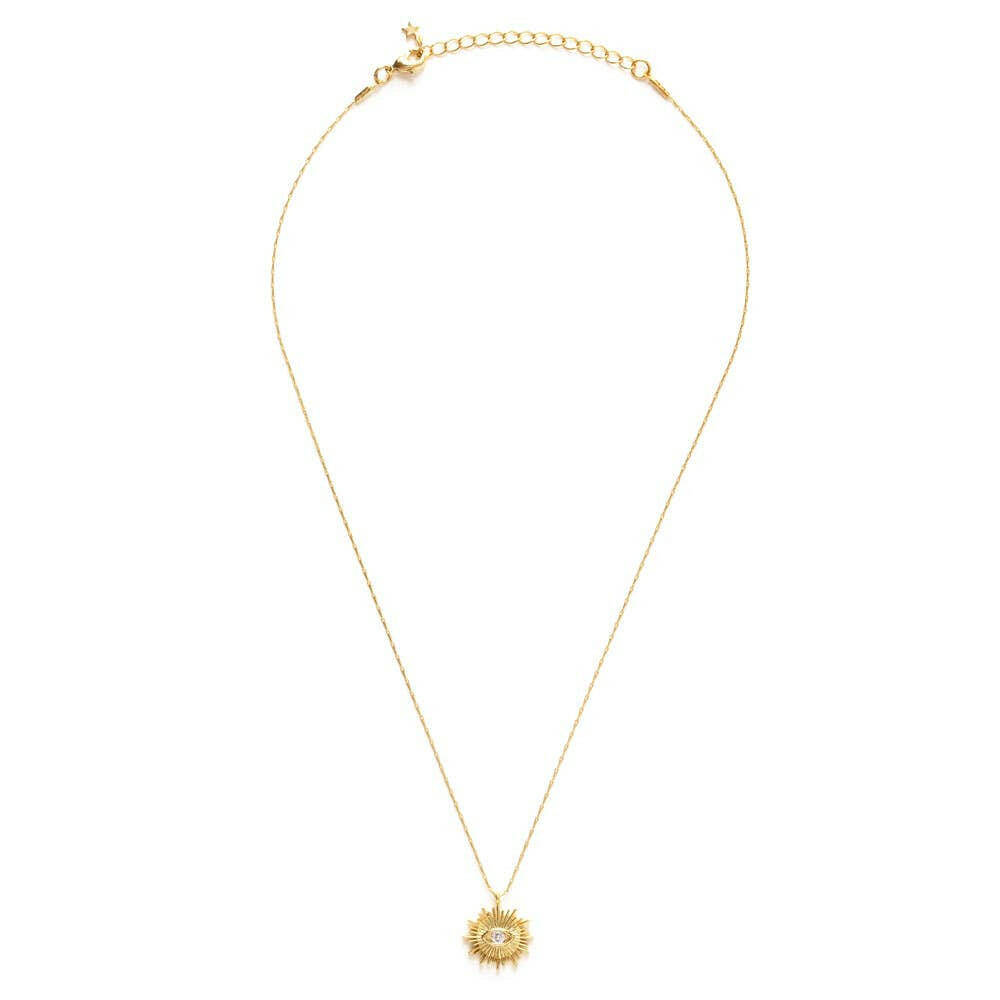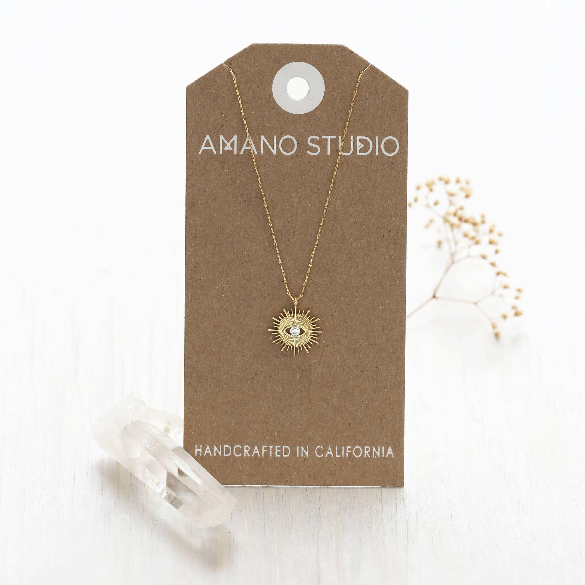 Protect yourself from the evil eye, gossip and all manner of bad vibes with this magical talisman. 14k gold over brass, 18" barley chain with a Czech crystal.