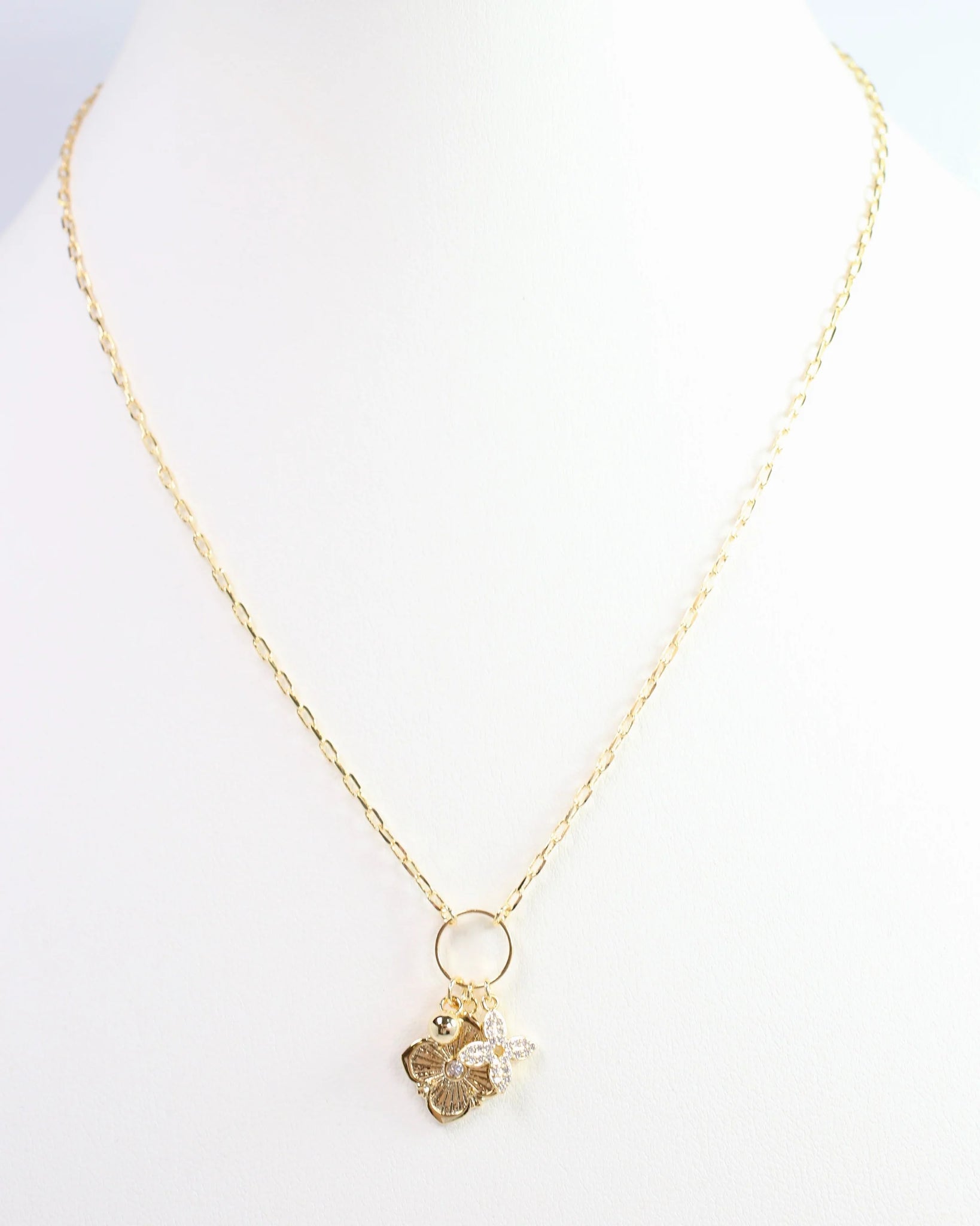Add a touch of playful elegance to your outfit with the Kylie Drop Charm Necklace in gold. The shiny gold finish and delicate paperclip chain perfectly complement the three charming additions - a textured clover, pave clover, and gold ball. Perfect for any occasion, this necklace exudes both classic and elevated vibes.