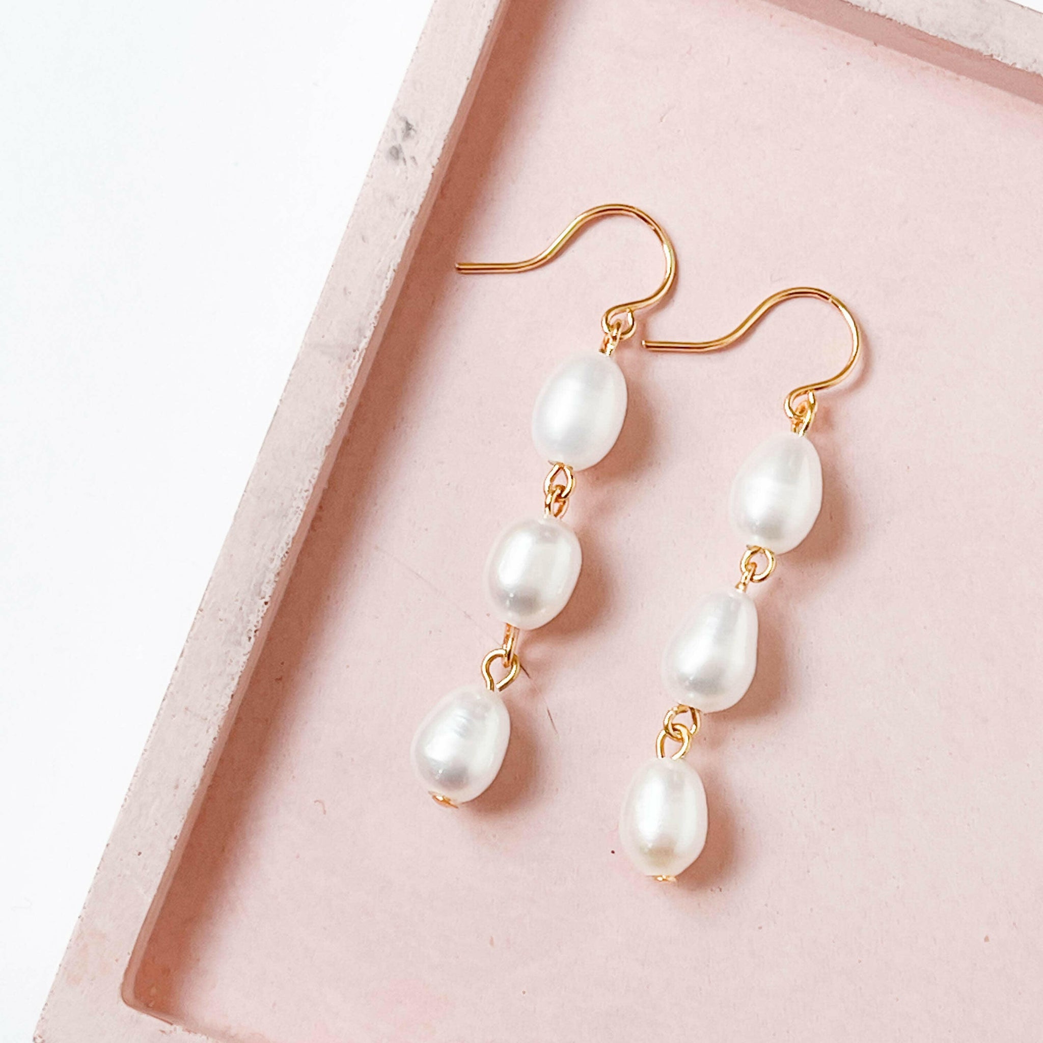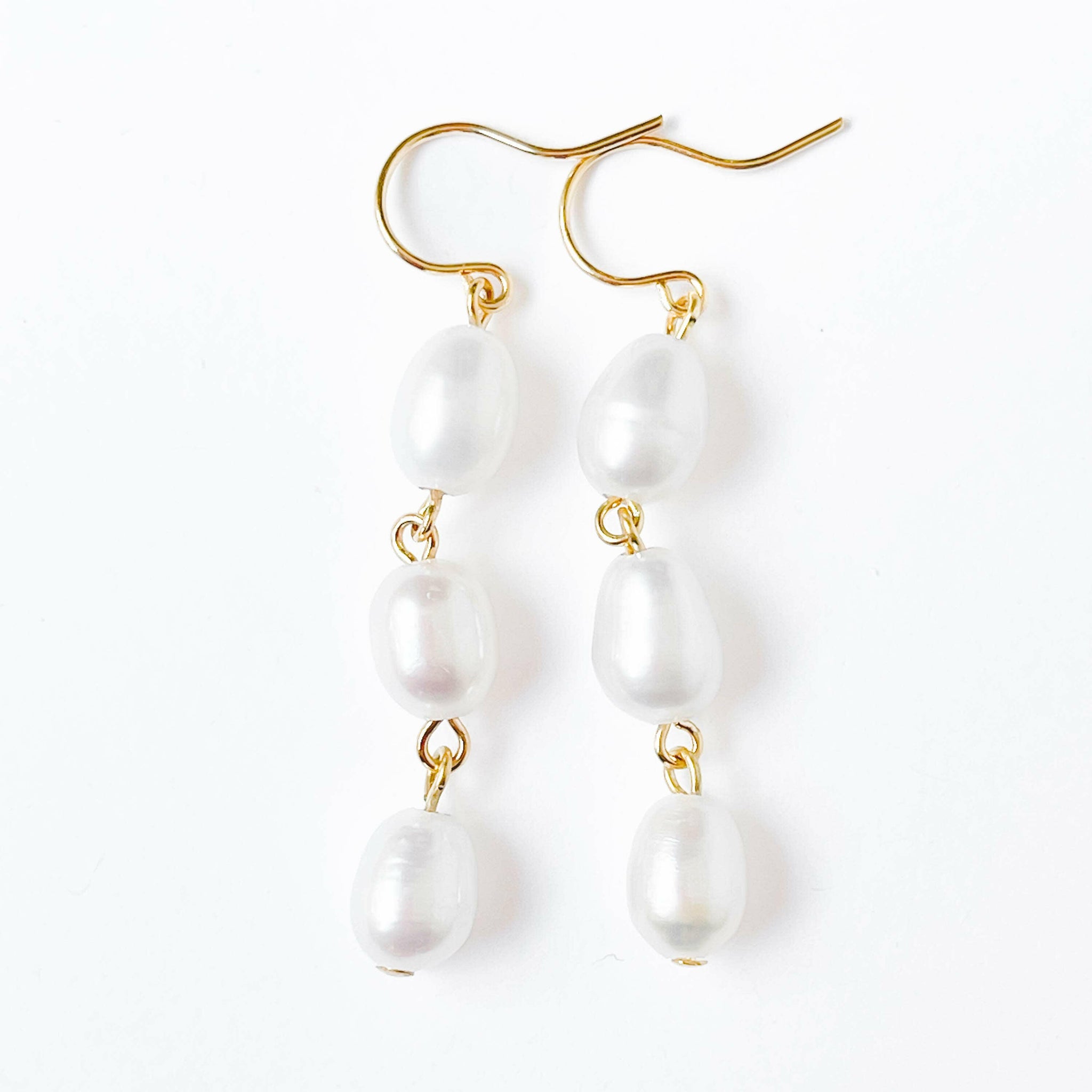 A lovely pair of freshwater pearl earrings made with three pearls hanging from 24K gold plated ear wires.