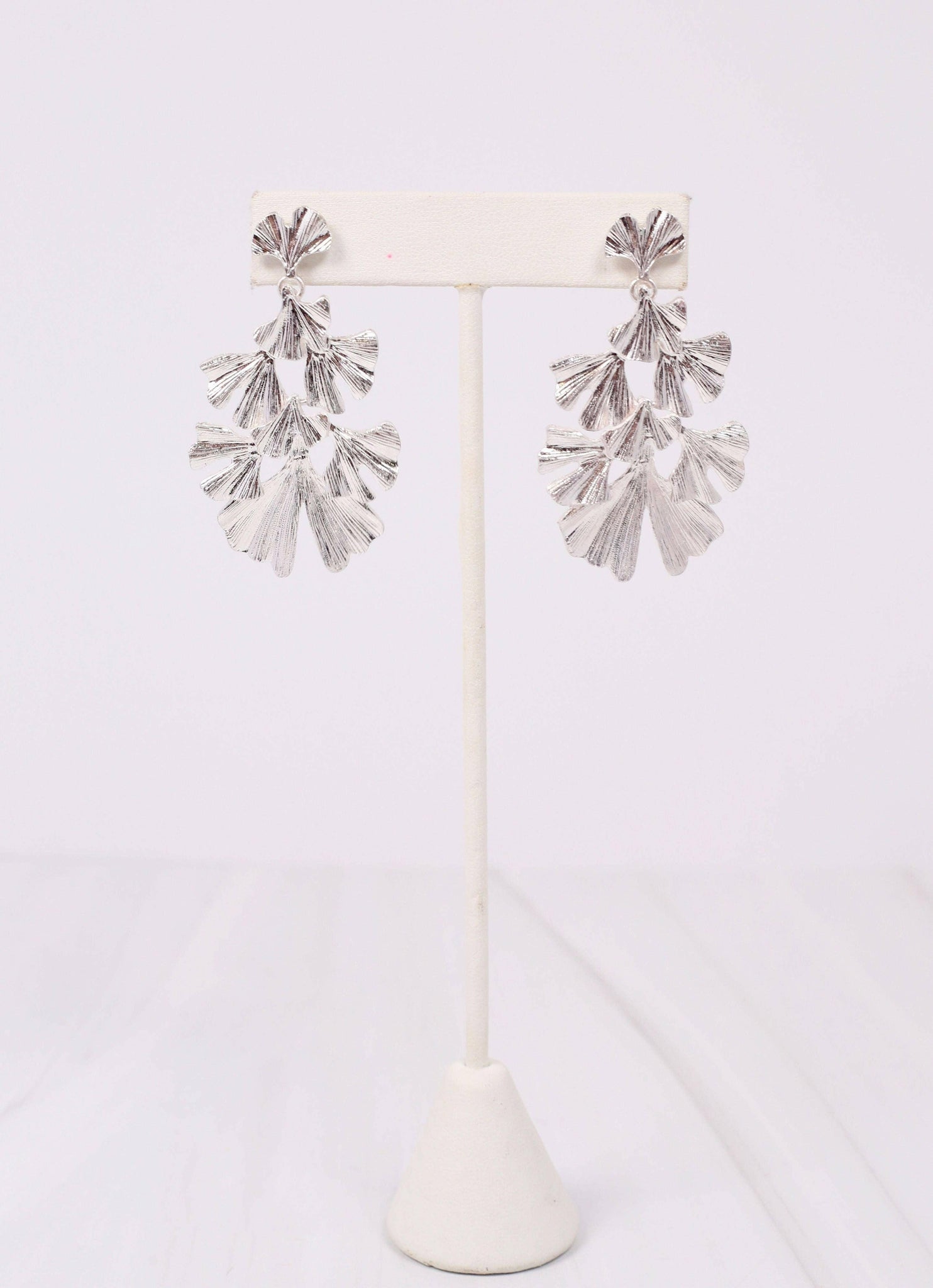 This metal earring has cascading tiers of scratched accents on a post back. Dimensions: 2" long