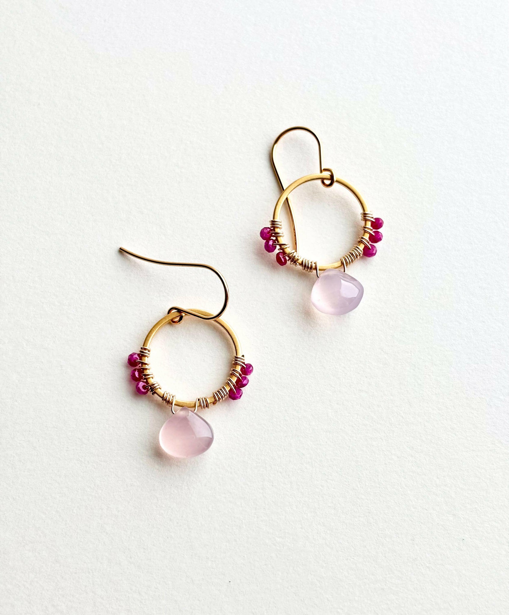 For the woman who likes to wear a bit of pink. Petite ruby gemstones have been paired with a lovely pink chalcedony stone. Makes a great drop earring. + Ruby. Chalcedony. 14K Gold Fill Ear Wire. 14K Gold Plate Circle. + Length: 1.25 inch. Pink Earrings