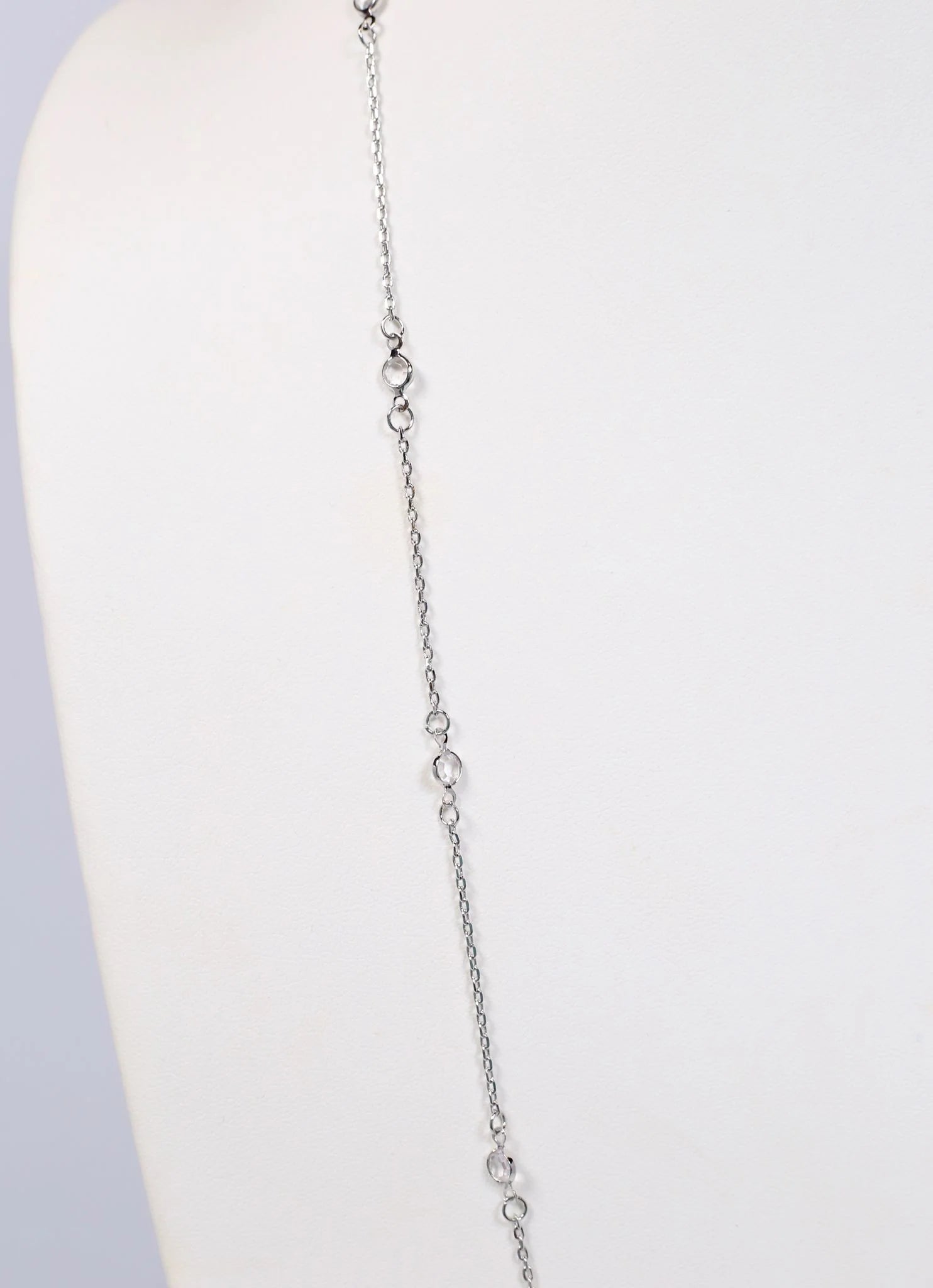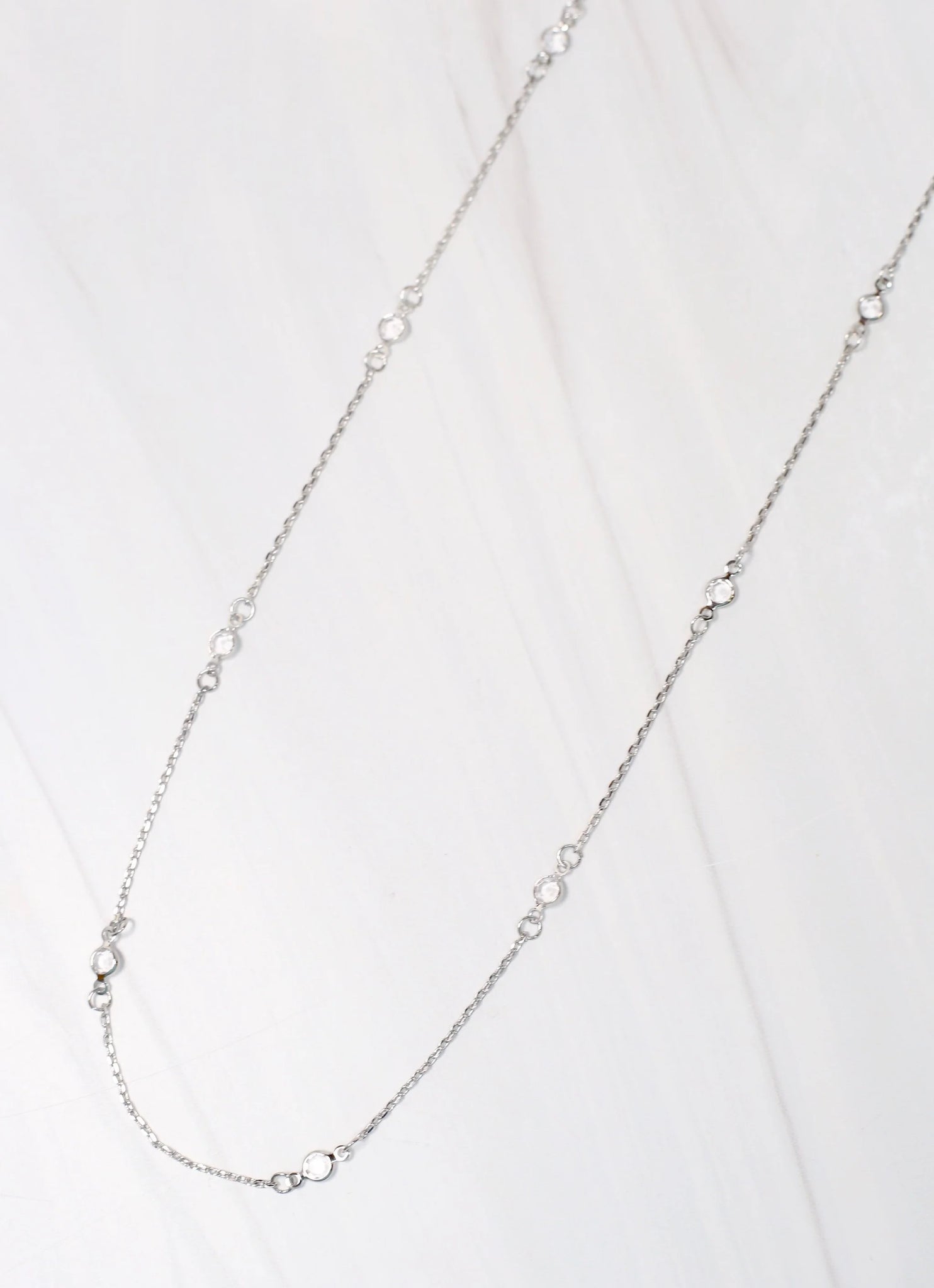 This necklace features clear stone accents. It's a great longer length necklace to wear alone or to layer with other pieces. Rhodium dipped.