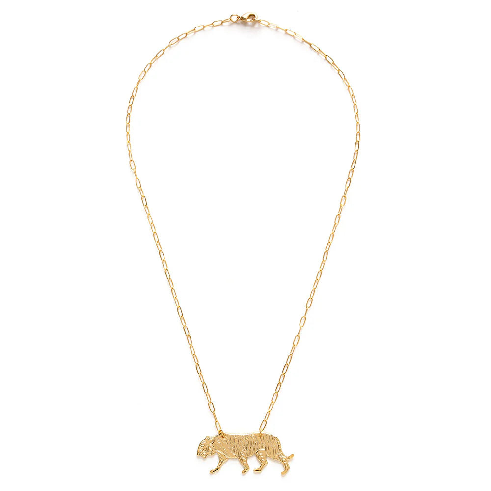 While combing the archives of American vintage molds, I spied this tiger pendant. He will be a great merchandising addition to the tropical foliage earrings we have. Tiger measures 1.75" on an 18" chain. Made of 14k gold plated brass. Genuine American Vintage. 100% made in the USA.