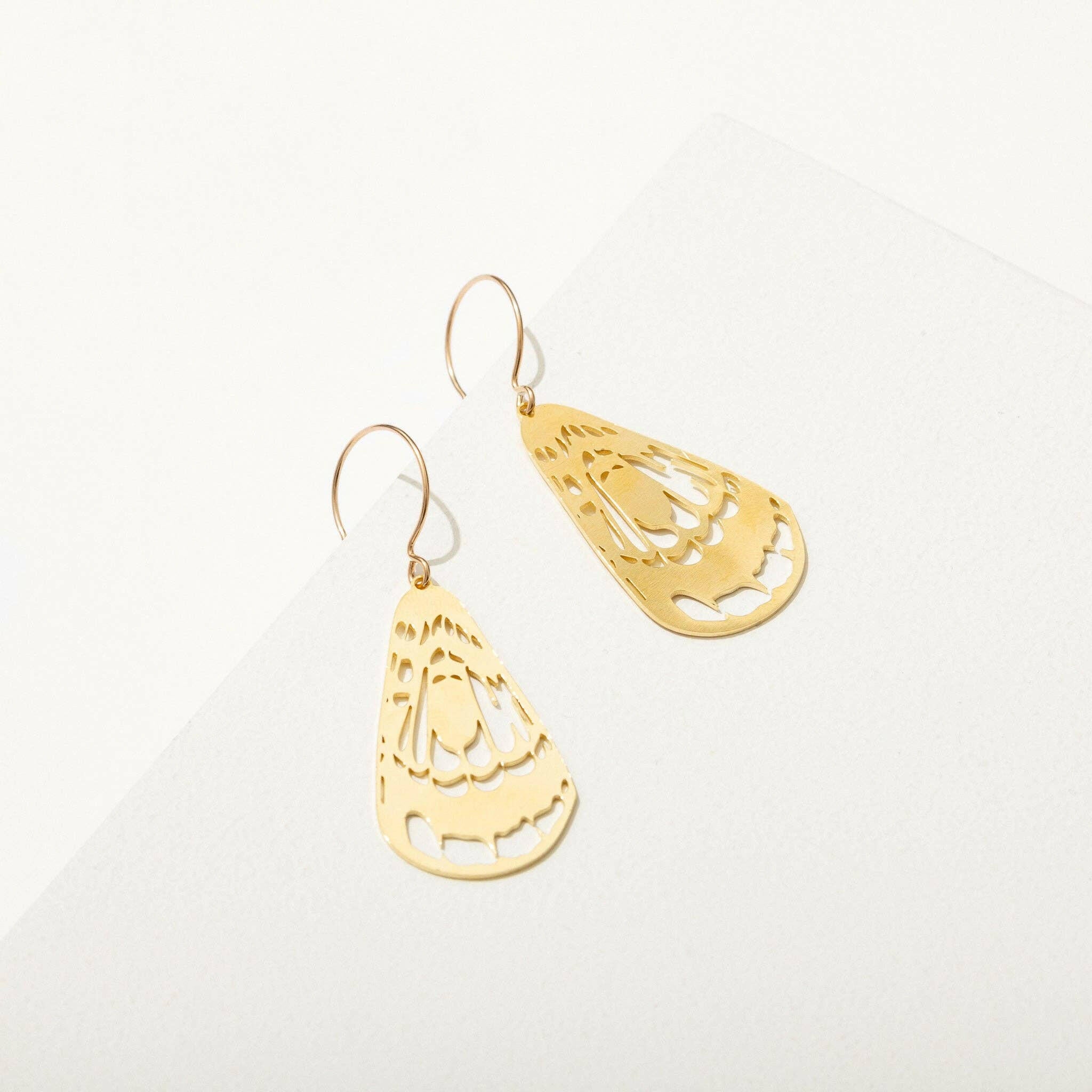 Connect with the transformation, rebirth, and bravery of the butterfly with these hand-drawn laser cut butterfly wing pattern earrings. Each 14k gold plated brass pendant measures 40mm x 22mm and features gold fill ear wires that are hypoallergenic and nickel free.