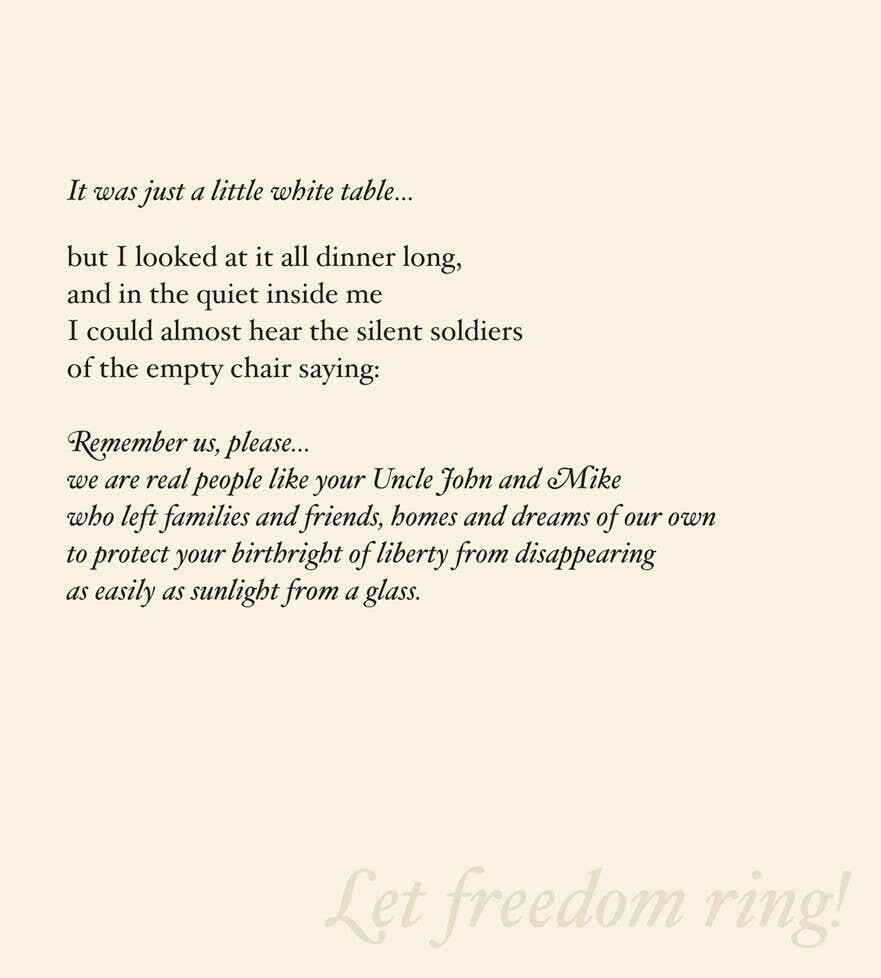 A little-known tradition outside of the military, with its roots in the Vietnam War era, the white table has been set in mess halls for decades in recognition of those lost or missing in action. In American's White Table, a little girl is asked to help set the Table to honor her uncle.
