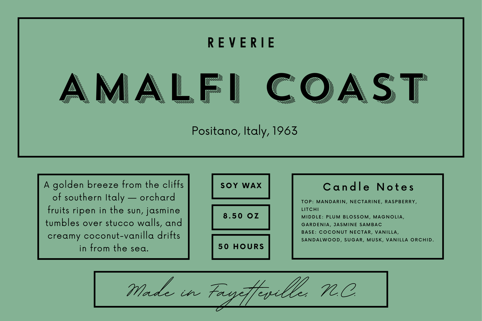 Hand-poured in Fayetteville, North Carolina using 100% soy wax and phthalate-free, premium fragrance oils, this candle brings European elegance and coastal warmth to any room, no passport required.