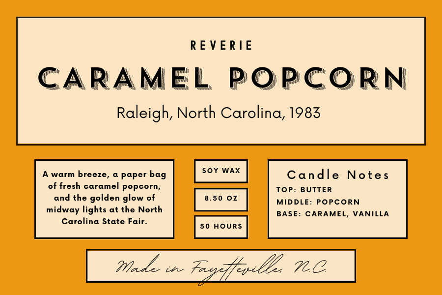 Caramel Popcorn captures the joy and wonder of the North Carolina State Fair in Raleigh — a tradition of sticky fingers, neon lights, and laughter rising above the roar of the rides. The scent opens with golden sugar and buttery toffee melting in a copper kettle, blending into rich caramel drizzled over warm, freshly popped corn. Hints of vanilla and toasted almond linger in the background, like the last sweet bite before the fireworks begin. It’s the memory of childhood wonder wrapped in sweetness and spun with nostalgia.
