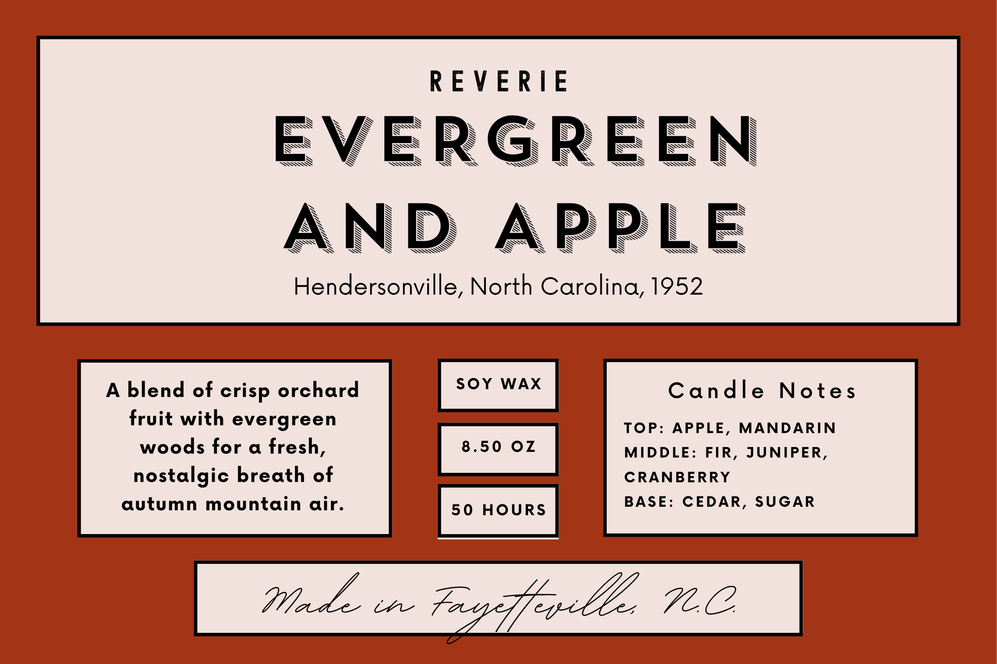 In the apple capital of North Carolina, 1952, fall meant baskets of fruit, pine-studded hillsides, and the sharp, clean scent of cold mountain mornings. Evergreen and Apple captures that brisk, nostalgic magic — where fir branches meet sweet fruit, and woodsmoke curls beneath sugar-crusted leaves.