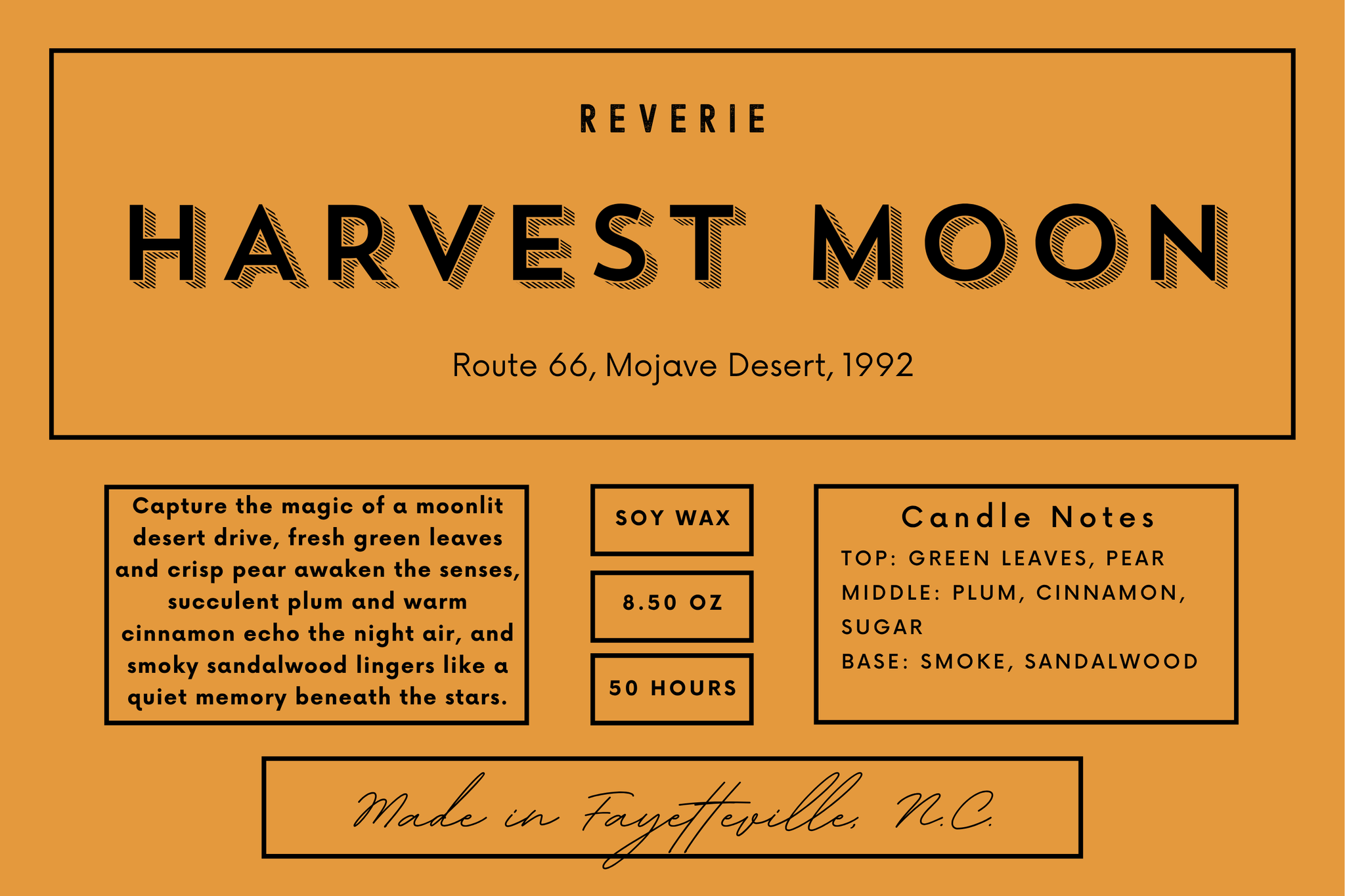 It’s 1992 on a quiet stretch of Route 66. The sky glows copper, the air hums with heat, and the harvest moon rises over the Mojave. Harvest Moon captures this vivid moment with top notes of green leaves and crisp pear, a heart of rich plum and warm cinnamon, and a base of smoky sandalwood. It’s a candle that feels both grounded and otherworldly — a road trip in slow motion.