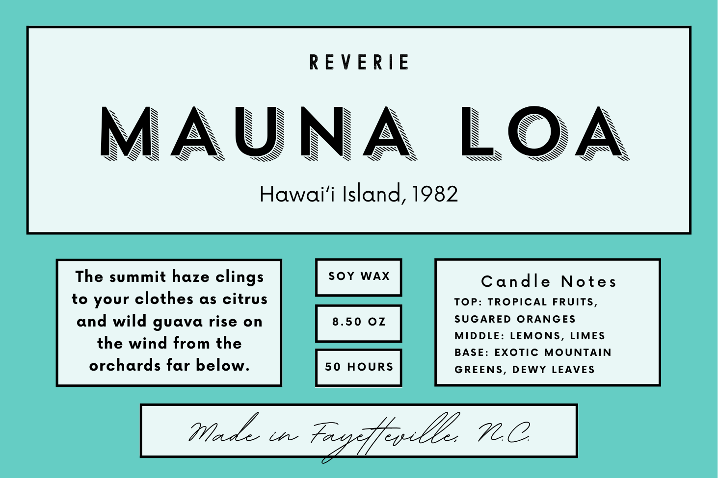 Hand-poured in our Fayetteville, North Carolina store, every candle in the Reverie line is a sensory postcard from the past. Crafted with 100% soy wax and infused with safe, premium fragrance oils, Mauna Loa brings island heat and fresh mountain air to any room.