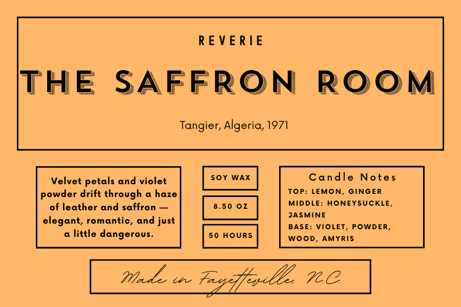 In the twilight salons of Tangier, 1971, the air was perfumed with intrigue. The Saffron Room captures that essence with a hypnotic blend of violet powder, jasmine, and aged leather, softened by golden saffron and grounded woods. Romantic, worldly, and a little unruly, it evokes velvet-lined rooms where every glance held a secret.
