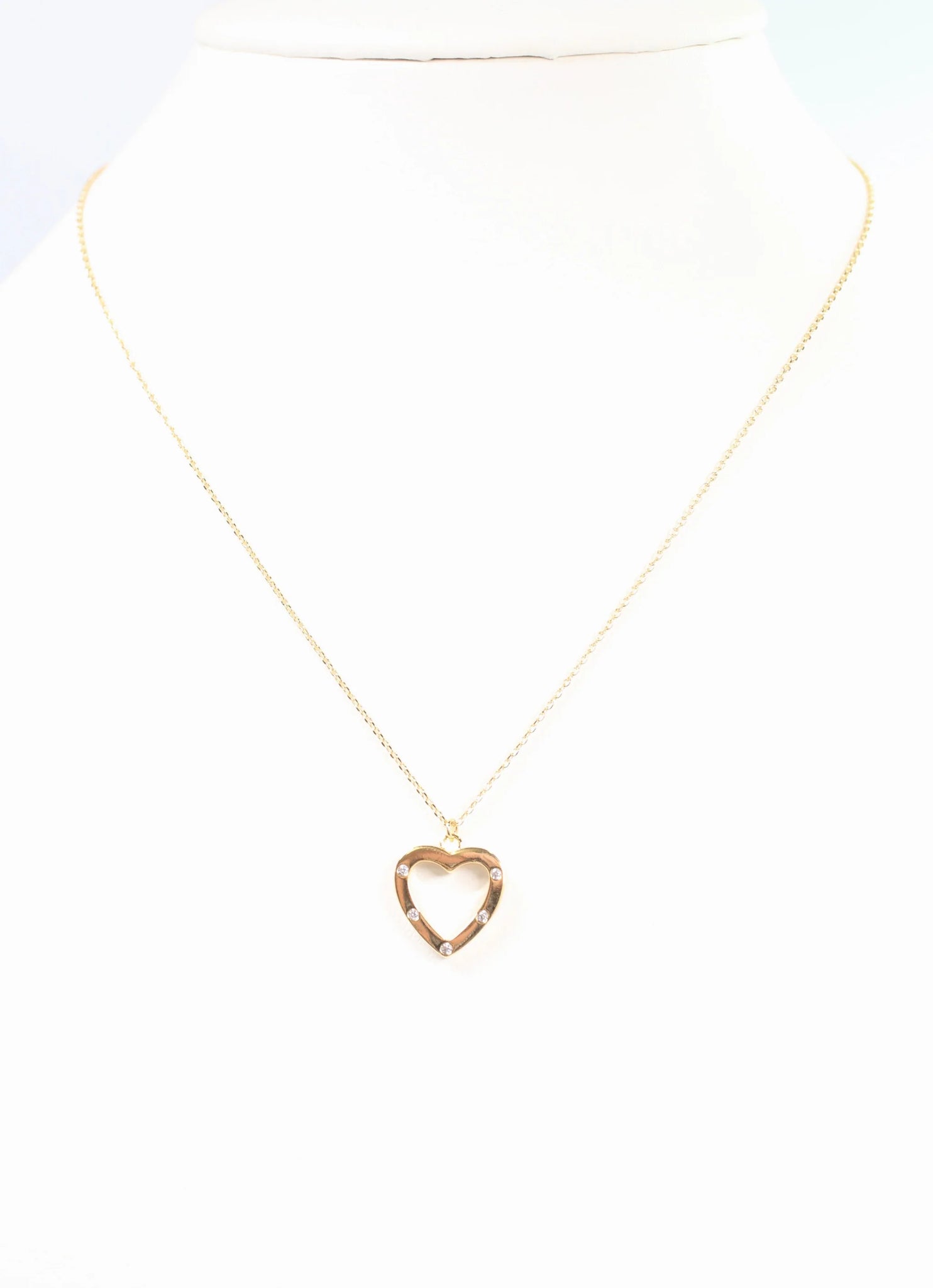 This simple strand necklace features an open gold heart charm with CZ accents.