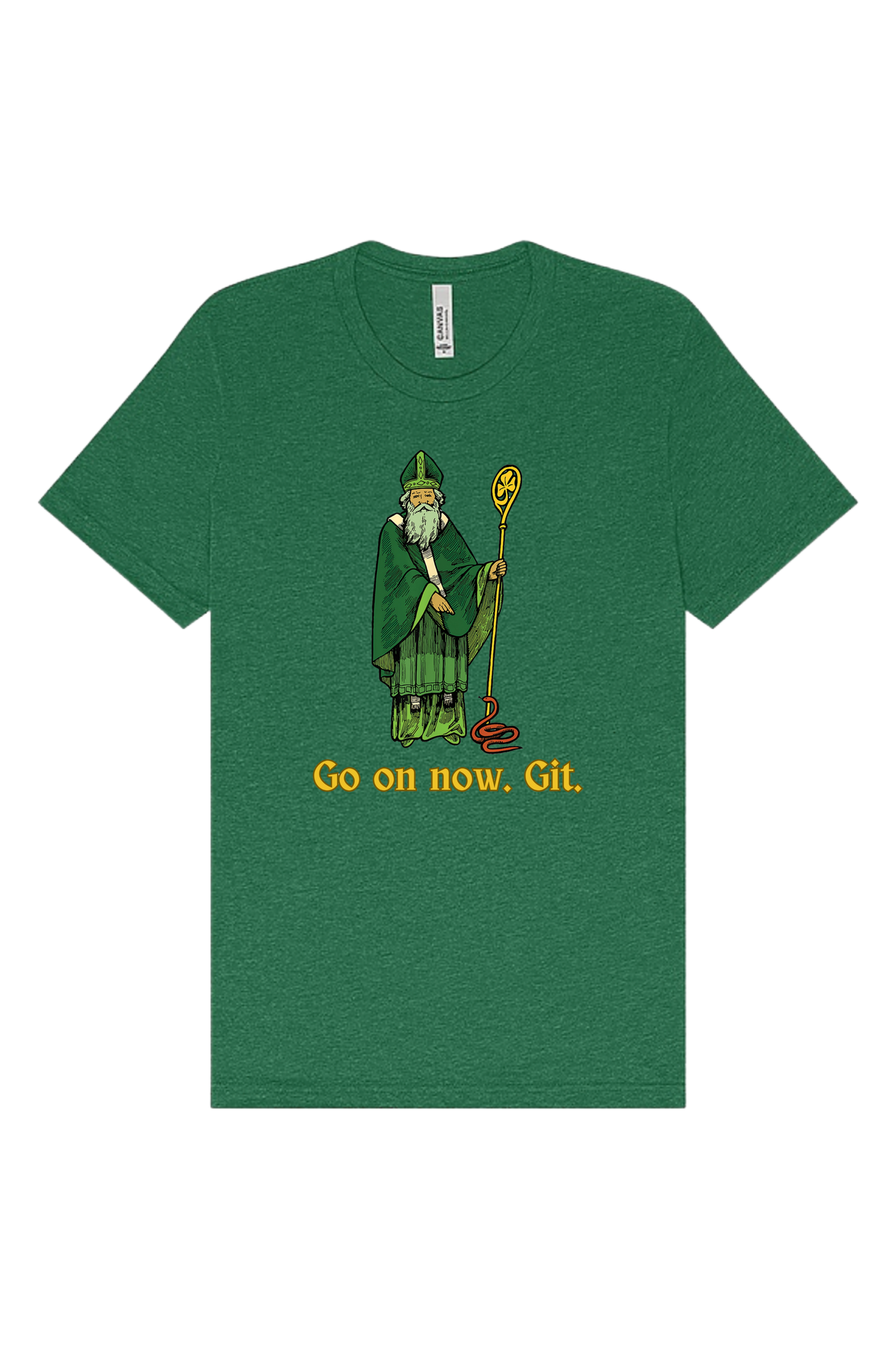 Saint Patrick “Go On Now, Git” Funny Southern St. Patrick’s Day Shirt | Heather Green Bella Canvas Tee