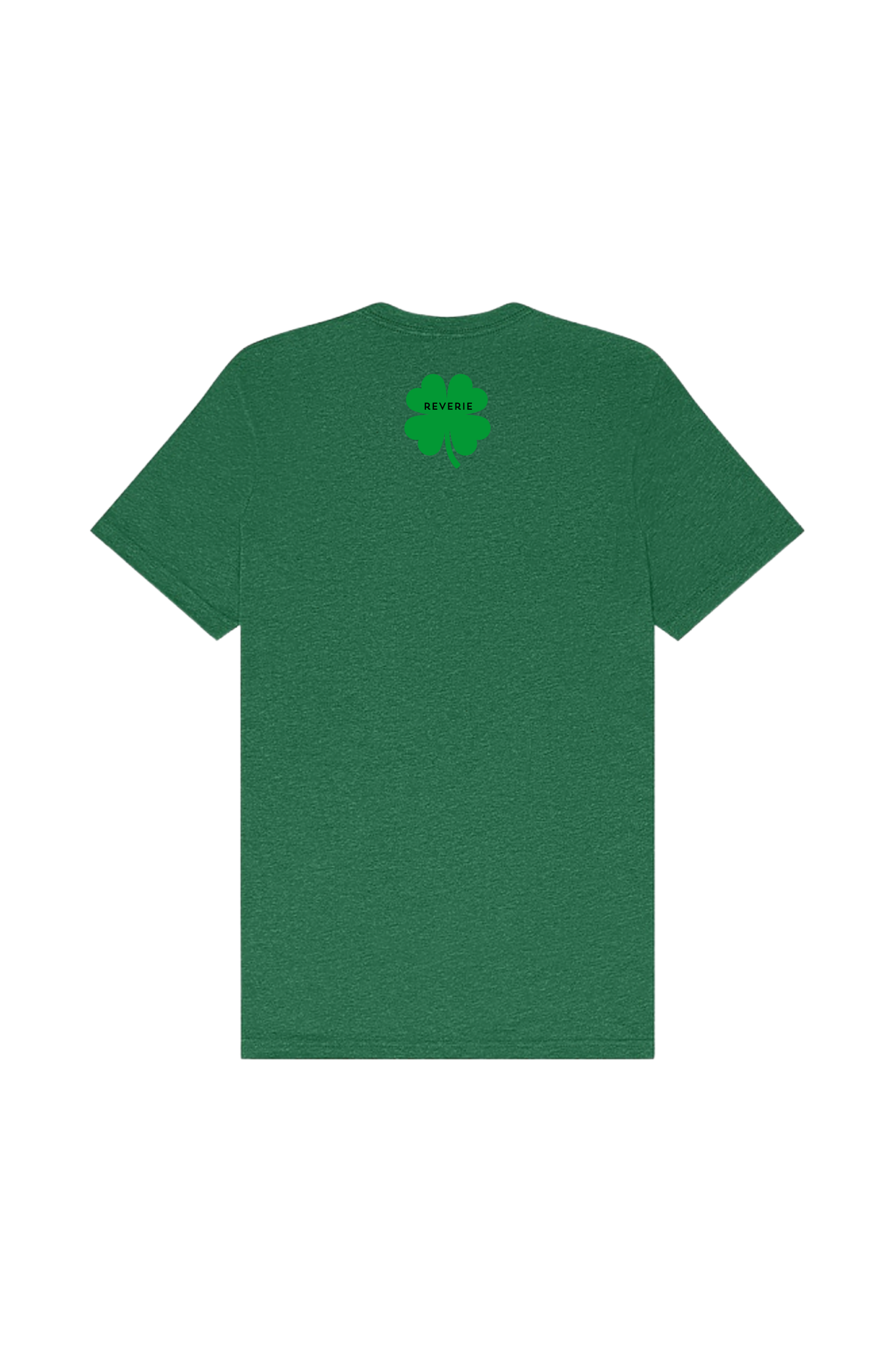 Back of heather green Saint Patrick’s Day shirt with small Reverie clover logo printed at the neck.